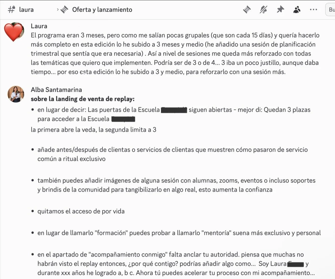 Diseñará tu roadmap para que tengas total claridad de las acciones que debes hacer cada trimestre, seguirá tu implementación paso a paso, responderá tus consultas y dudas y te dará feedback a diario en tu canal 1:1. Esta mentora no es una asistente, realmente es una profesional con experiencia real en estrategia de negocio y marca personal, que además ha vivido nuestro propio crecimiento a más de 1M€.